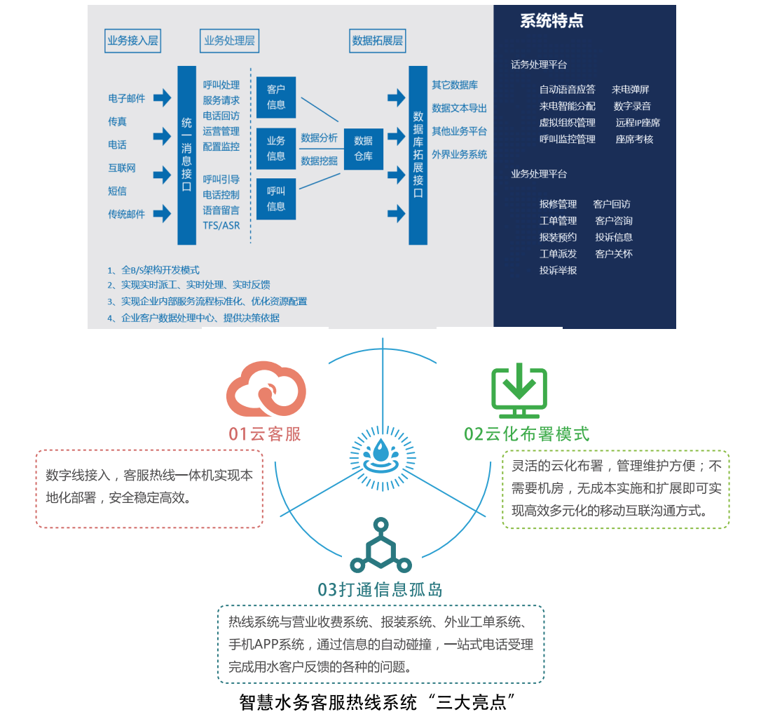 “智慧城市”加速建设的今天,智慧水务成为新一轮的建设热点。EVO视讯EVO科技以服务为目标,以产业为依托,以技术为主线,推出“智慧水务客服热线系统”,强化水务管理,优化服务体系,已成为企业与用户之间沟通的桥梁,极大提高了为民“排忧解难”效率。