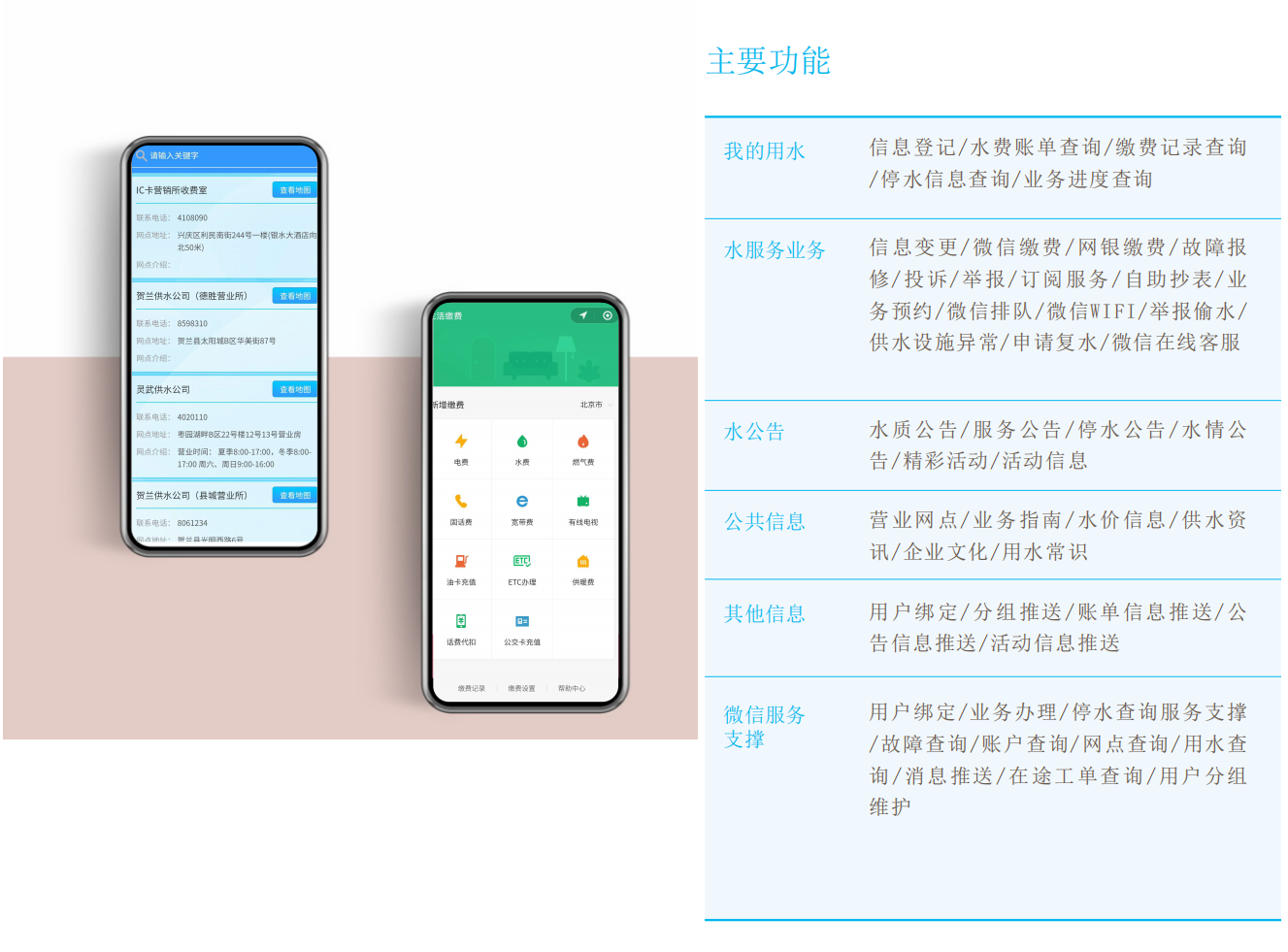 微信公众平台实现与GIS、营业收费系统、报装业务系统、供水热线服务等系统的集成,为用户给予丰富和实时的服务和营收业务内容。