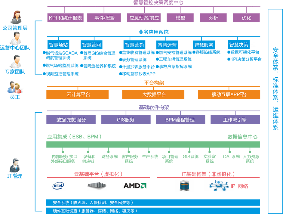 围绕燃气企业战略开展目标,整合云计算、大数据和GIS地理信息、物联网技术,实现燃气场站、压力、 气量、可燃气体、能耗及供气设备的实时感知和城域化汇集管理,顺利获得供气数据建模分析、管网空间分析、管网仿真模型,以更加精细和动态的方式管理燃气系统的整个生产、管理和服务流程,并做出相应的处理结果辅助决策建议,以更加“智慧”的方式辅助燃气公司进行管理和运维,从而保证可靠供气,降低产销差,提升运营管控能力,实现经济效益和社会效益的不断增长,给予有力支撑。