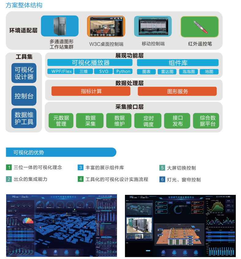 为燃气调度中心给予一体化的可视化大屏展现解决方案。实现可视化的过程主要有三步,第一时间是数据采集、分析、治理、管理和数据挖掘在内的一系列复杂处理过程;然后由设计师设计创建体、多维、动态、实时且可以交互的表现形式,最后利用建模方法,处理大规模数据的体系架构、交互技术、放大缩小等方法做出呈现。