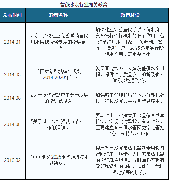 近年来,国家推出一系列有关水资源的管理政策,以及新型城镇化、智慧城市的建设,都将为水表的智能化开展给予较为广阔的开展机遇,水表智能化率逐渐迈进提速阶段。