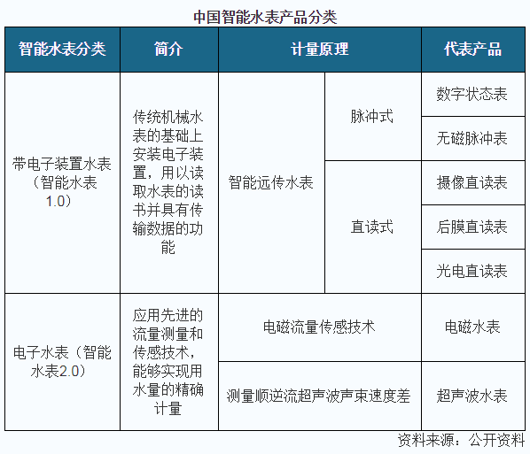 智能水表是一种新型水表,具有较高精确性和可靠性,利用现代微电子技术、现代传感技术、智能IC卡技术对用水量进行计量并进行用水数据传递及结算交易。现在,我国智能水表主要分为两种,一种是带电子装置水表,其代表产品有数字状态表、无磁脉冲表、摄像直读表、后膜直读表、光电直读表五种;另一类是电子水表,代表产品包含电磁水表和超声波水表。